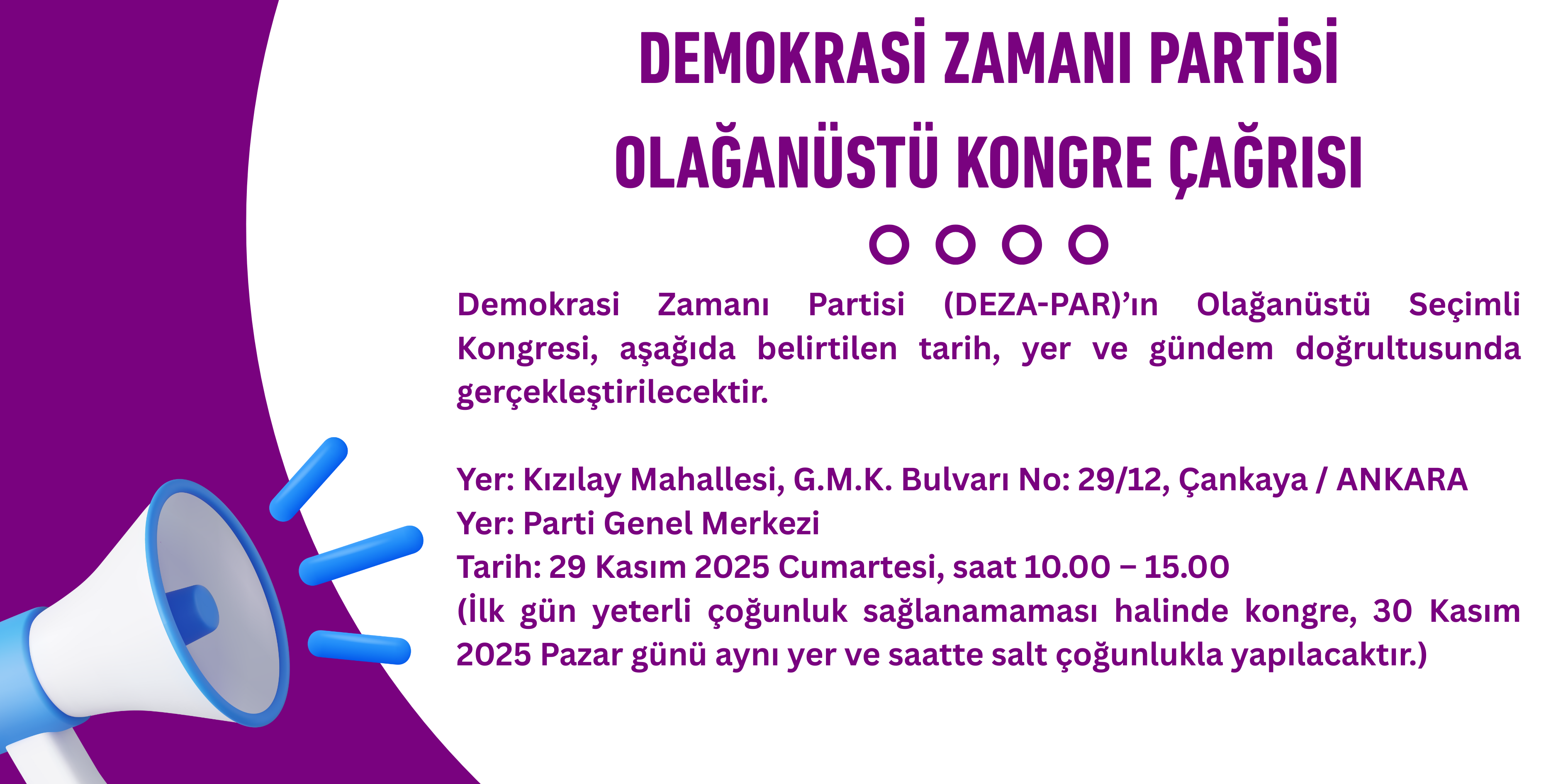 DEMOKRASİ ZAMANI PARTİSİ (DEZA-PAR) OLAĞANÜSTÜ KONGRE ÇAĞRISI
